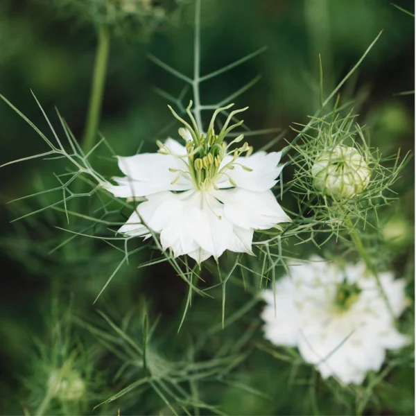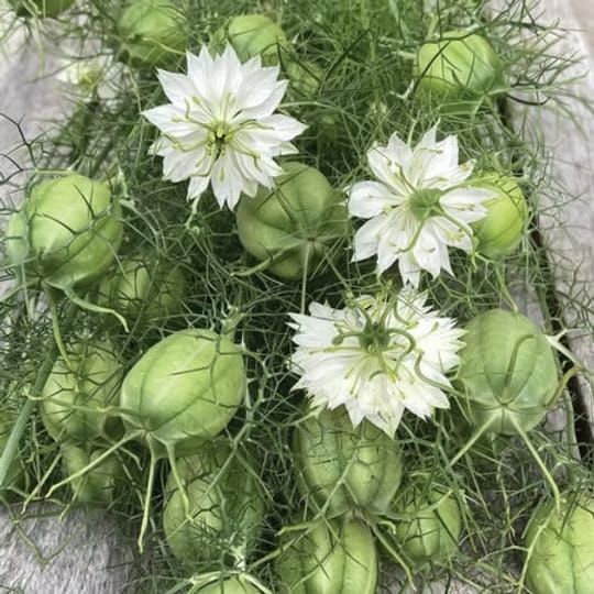 This unusual Nigella bursts into a profusion of delicate and whimsical white flower stars which are then followed by a bright green seed pod which is super useful dried. A must, easy grow for your flower filled garden!